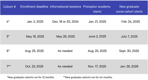 - Your enrolled new graduate nurses participating in the 12-month program that includes clinical preceptorship and monthly reflection groups.