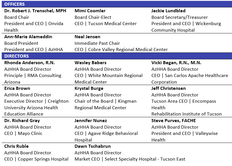 AzHHA’s Board of Directors includes hospital and healthcare leaders representing various hospitals throughout Arizona – from large health systems to rural hospitals. The fundamental responsibilities of the board officers and Board of Directors are to set policy and broad strategic direction toward the fulfillment of AzHHA’s mission.